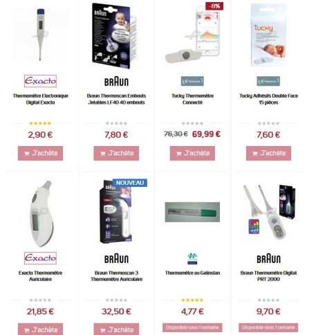 Nous avons encore des thermomètres en stock : thermomètre connecté, thermomètre auriculaire, et thermomètre digital. Attention : évolution très rapide de nos stocks sans date de réapprovisionnement définie.