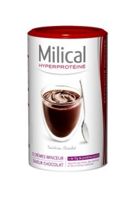 Milical Hyperprotéiné Crème Minceur Chocolat est un en-cas hypocalorique hyperprotéiné diététique en poudre, à reconstituer pour boissons, appauvri en glucides et en lipides, avec édulcorants, enrichi en fibres prébiotiques, calcium, magnésium, fer, zinc, vitamines A, D, E, B1, B2, B6, B9, C, pour 100Kcal et 15g de protéines par portion.