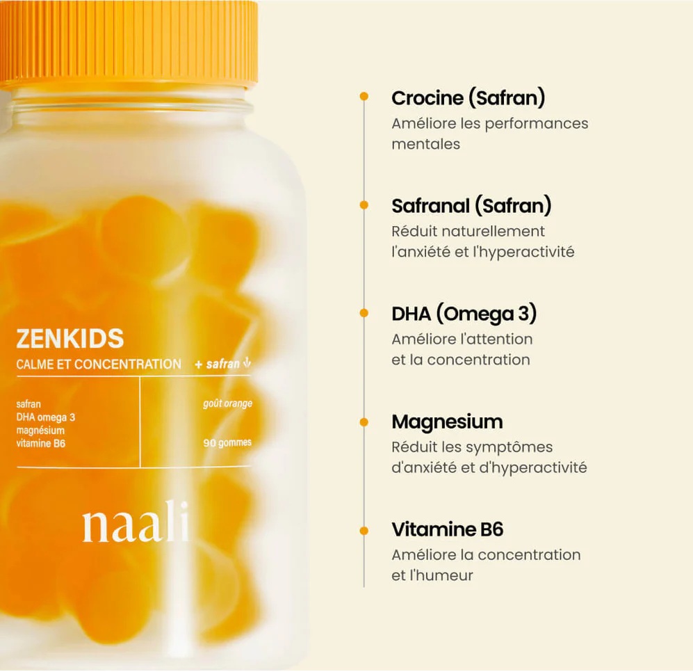 Le TDAH (Trouble du Déficit de l’Attention avec ou sans Hyperactivité) touche de nombreux enfants, impactant leur concentration et leur comportement. Naali ZenKids Safran TDAH est un complément alimentaire innovant, conçu pour aider à apaiser les enfants de manière naturelle. Composé de safran, une plante reconnue pour ses vertus relaxantes, ce produit offre une solution douce et efficace pour améliorer l’attention et la gestion du stress chez les plus jeunes.